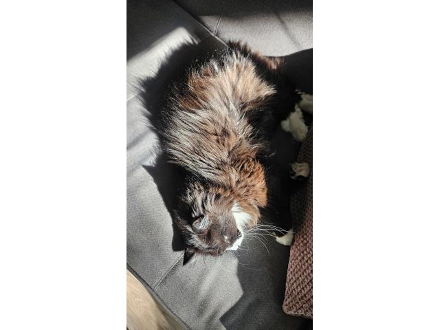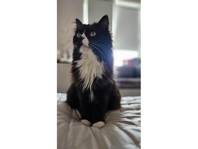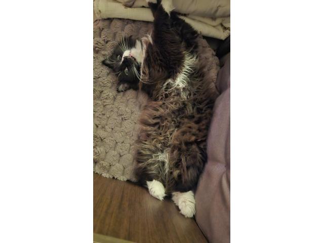 Окрас: черный с белыми лапками и белой грудкой, длинные белые усы, длинношерстный, немного приоткрыт рот,без хвоста. Чипирован, примерно 5 лет, кастрирован.