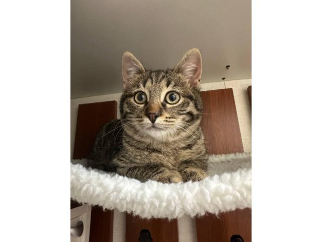Описание: маленький домашний котёнок, серо-коричневый полосатый окрас,