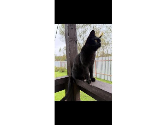 Черная кошка, глаза песочного цвета, есть шрам под нижней губой