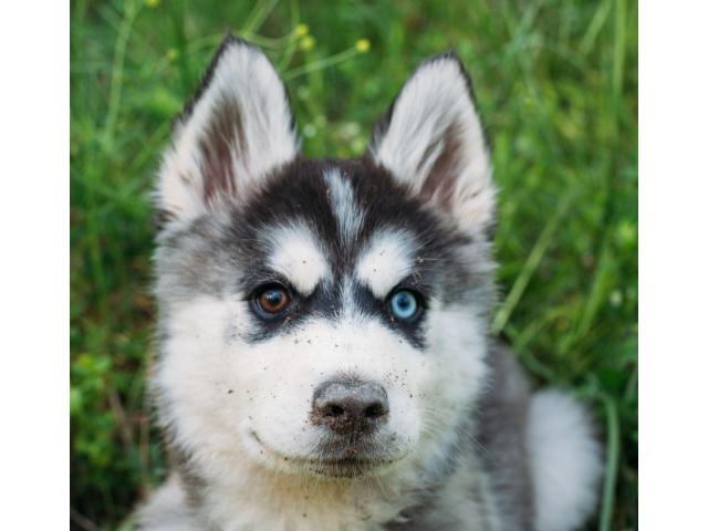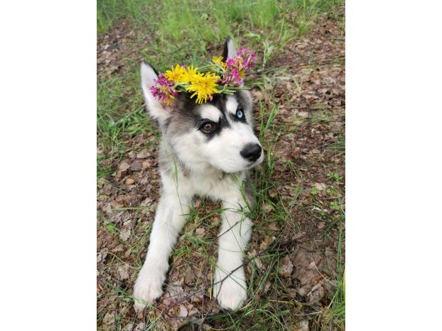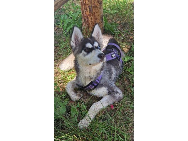 Хаски, кличка Майя. Глаза разного цвета. На ней был розовый ошейник